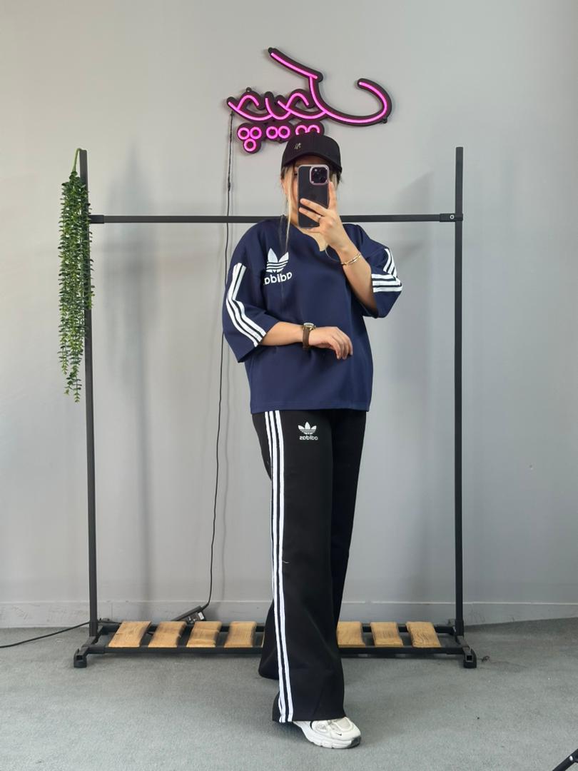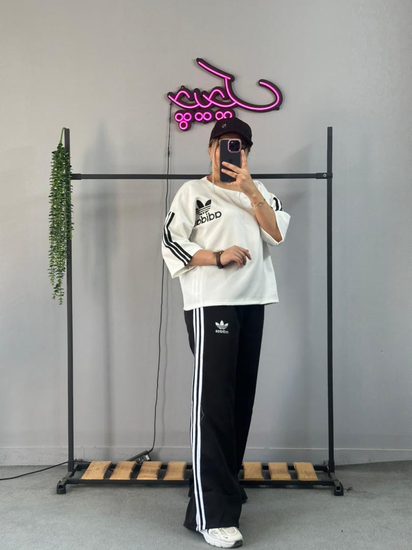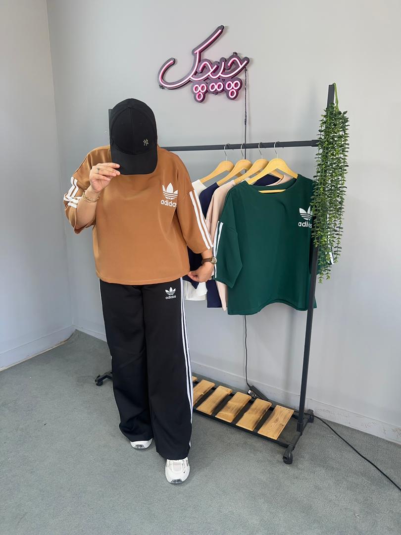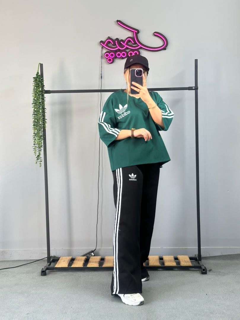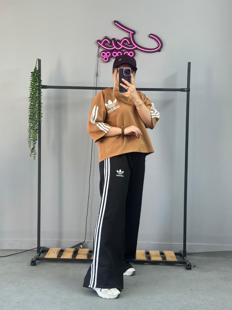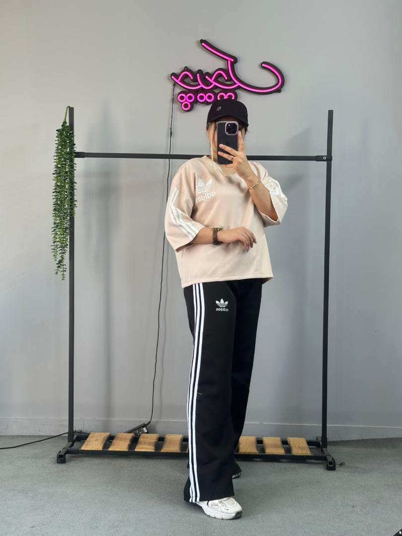 ست اسپرت زنانه شامل بلوز و شلوار راحت و شیک، با طراحی برند آدیداس. مناسب برای استایل روزمره، ورزشی و کژوال.
