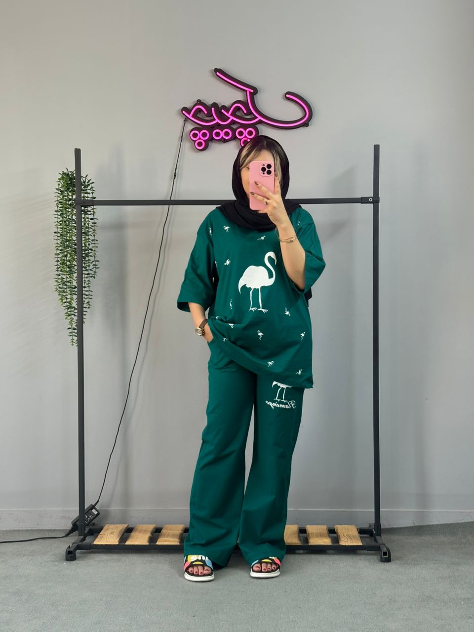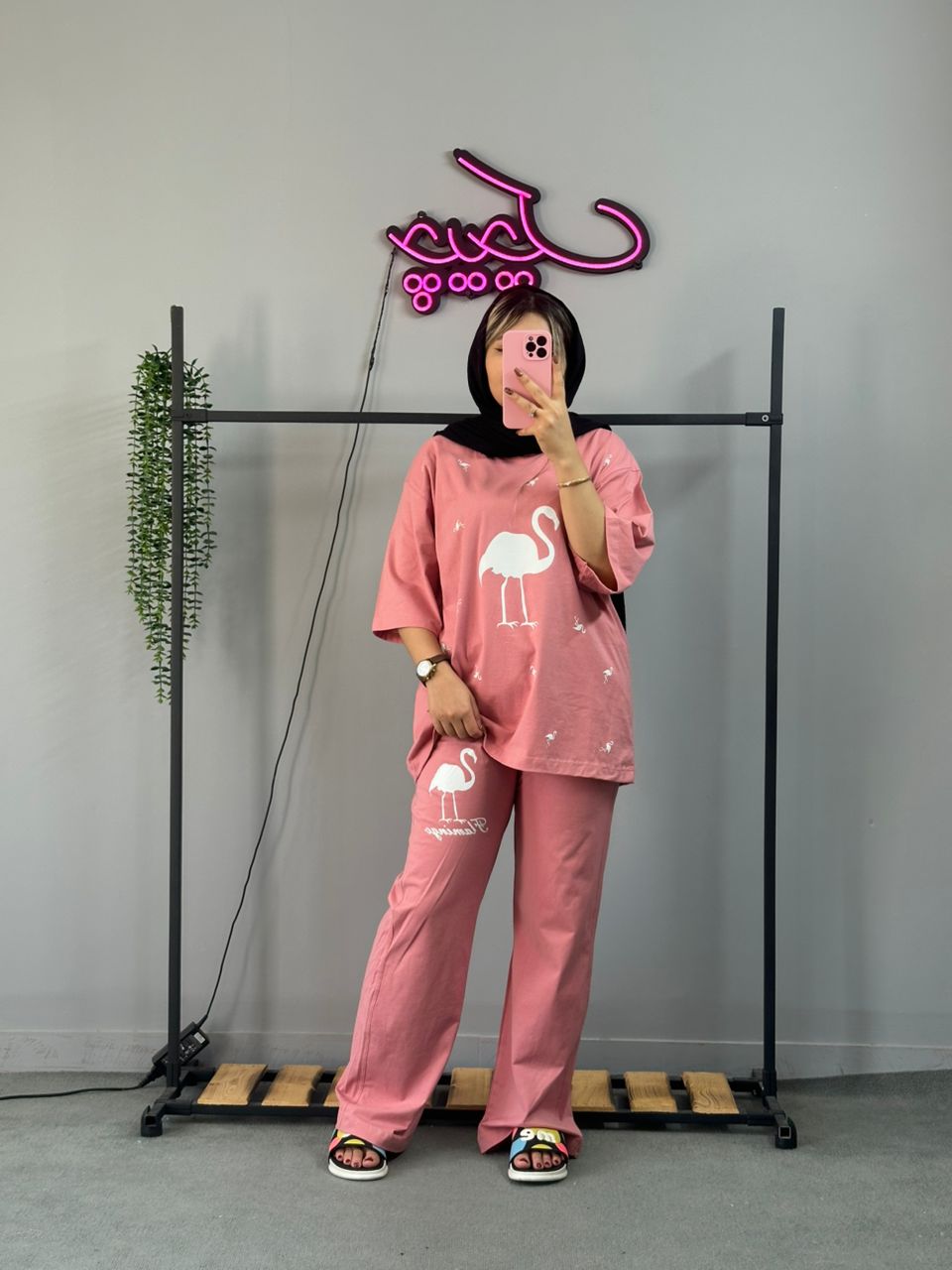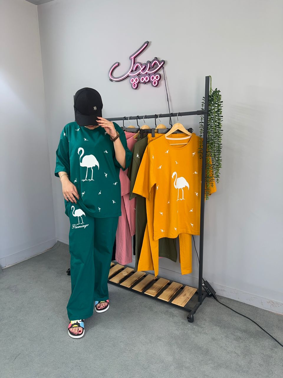 ست جذاب و راحتی شامل لانگ و شلوار بگ با طراحی خاص و چاپ فلامینگو، انتخابی ایده‌آل برای استایل خانگی یا دورهمی‌های دوستانه.