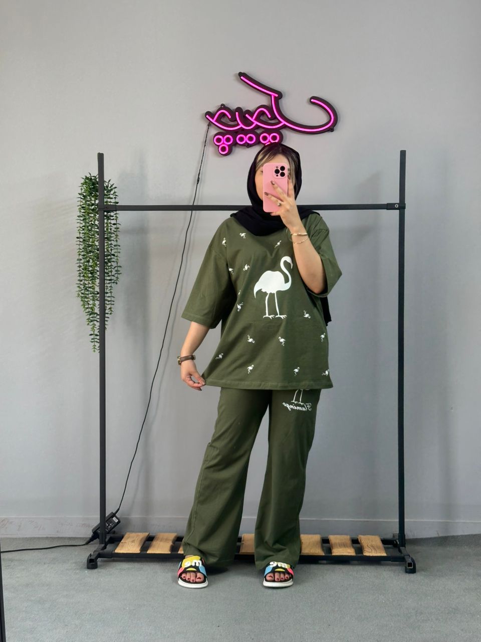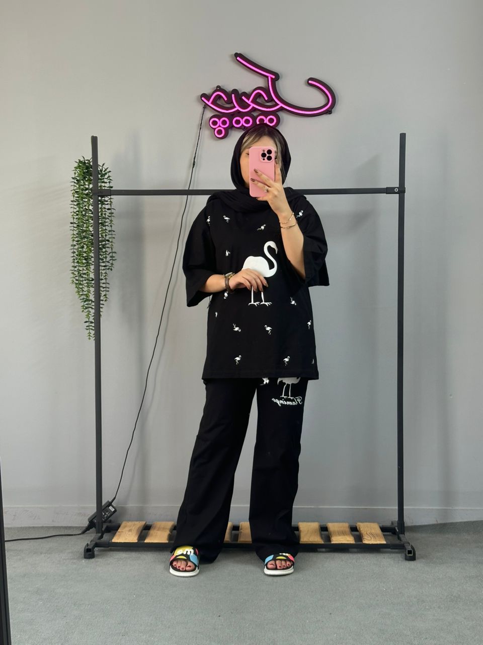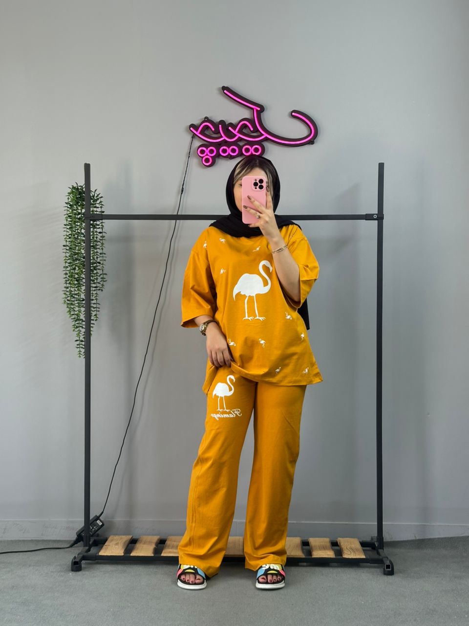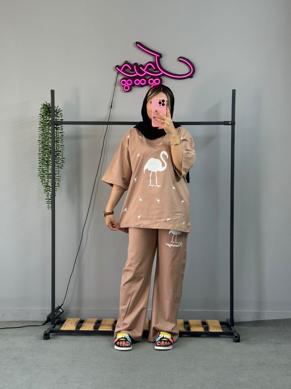 ست جذاب و راحتی شامل لانگ و شلوار بگ با طراحی خاص و چاپ فلامینگو، انتخابی ایده‌آل برای استایل خانگی یا دورهمی‌های دوستانه.